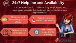 ICICI Bank provides 24/7 (i.e. 24 hours a day, 7 days a week, 365 days a year) access to their customers via their customer care helpline service. This means that ICICI Bank provides support to its customers 24 hours a day, seven days per week, including all weekends and many public holidays, so that customers always have the ability to access help when they need it. This gives customers peace of mind and allows them to block their debit/credit cards immediately if they lose or have their cards stolen or report suspicious/unauthorised activity immediately. It also provides help to customers when their regular banking hours are closed, when they may need emergency assistance while travelling or for other urgent financial emergencies. The 24×7 customer care helpline provides ongoing protection from fraud, service interruptions, and security threats to customers.