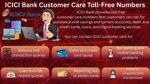 ICICI Bank provides toll-free customer care numbers that customers can call for assistance with savings and current accounts, debit and credit cards, loans, and digital banking services. You can contact ICICI customer care for balance and transaction queries, card-related issues, net banking and mobile banking problems, loan and EMI enquiries, reporting lost or stolen cards, and fraud or unauthorized transactions. Trained executives verify your identity and ensure secure and confidential assistance.